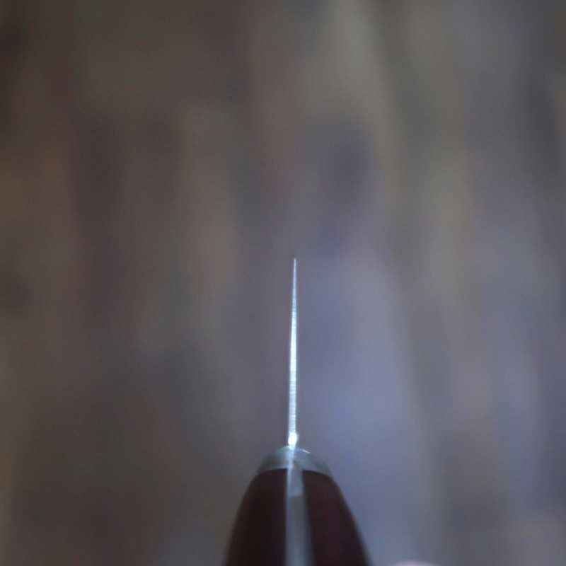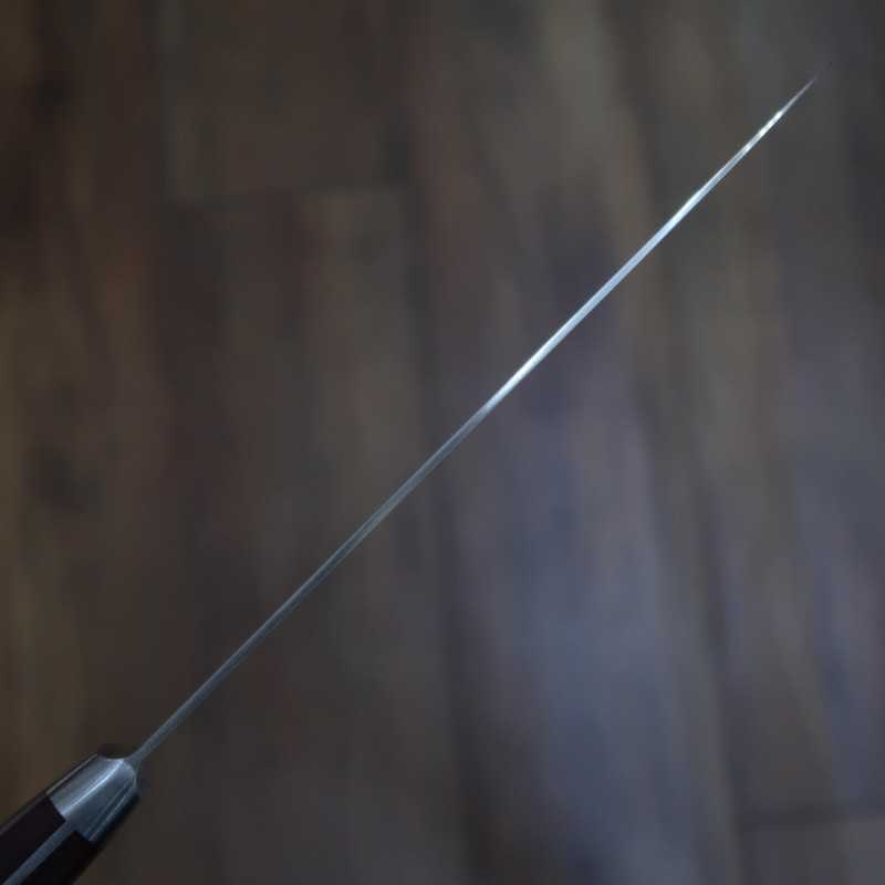 Una hoja equilibrada de gran dureza, filo y facilidad de afilado, con una forma ortodoxa pero imponente, pensada para profesionales.