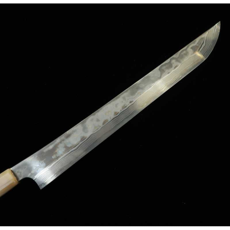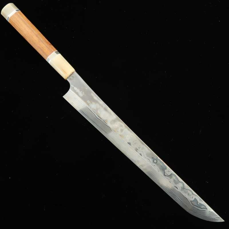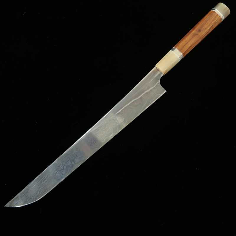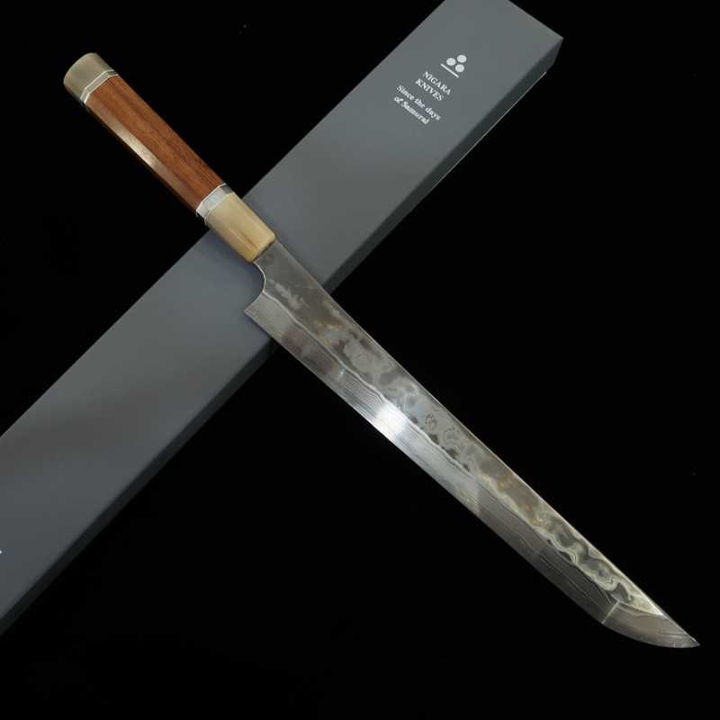 Nigara Hamono NIGARA Aogami nº2 x Shirogami nº2, núcleo sin costuras, Damasco, Yanagiba de punta redonda, mango personalizado (300 mm)