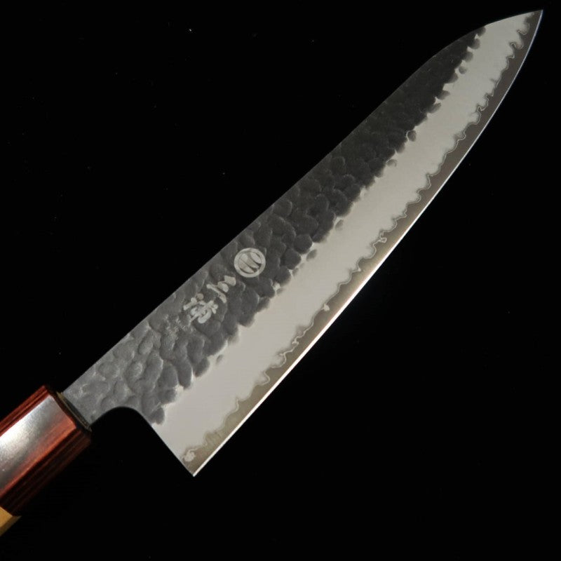 Couteau dont le cœur en acier bleu super est enveloppé entre deux couches d’inox pour allier tranchant et longévité.