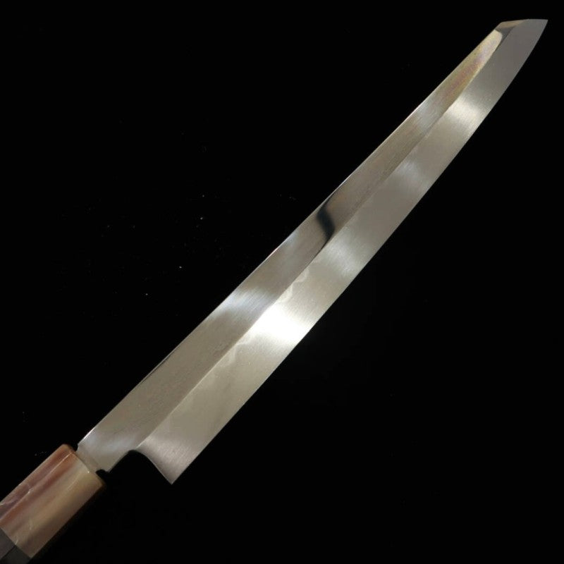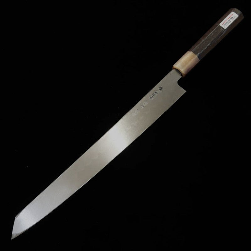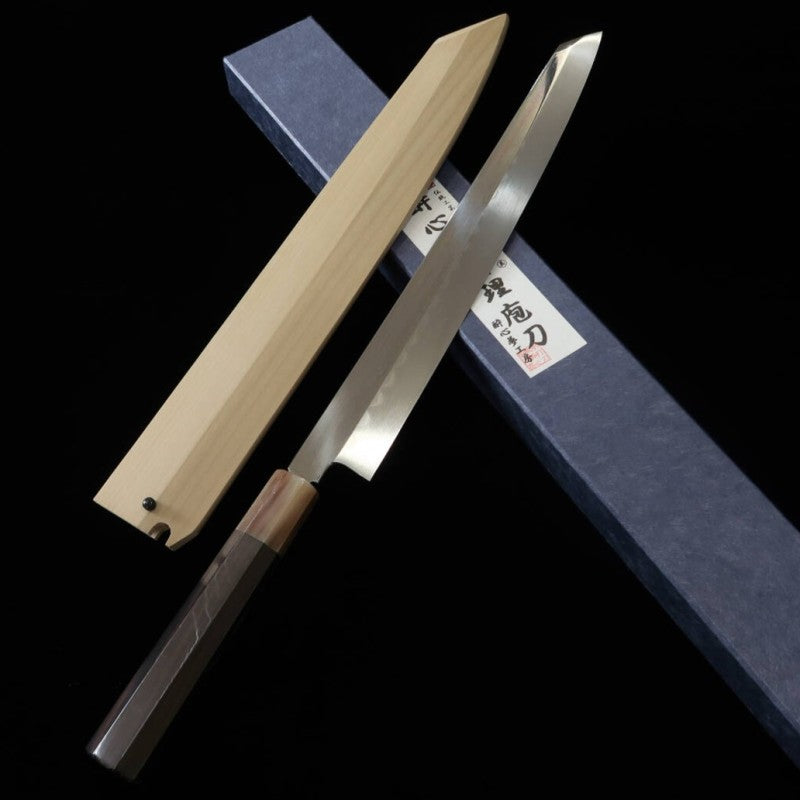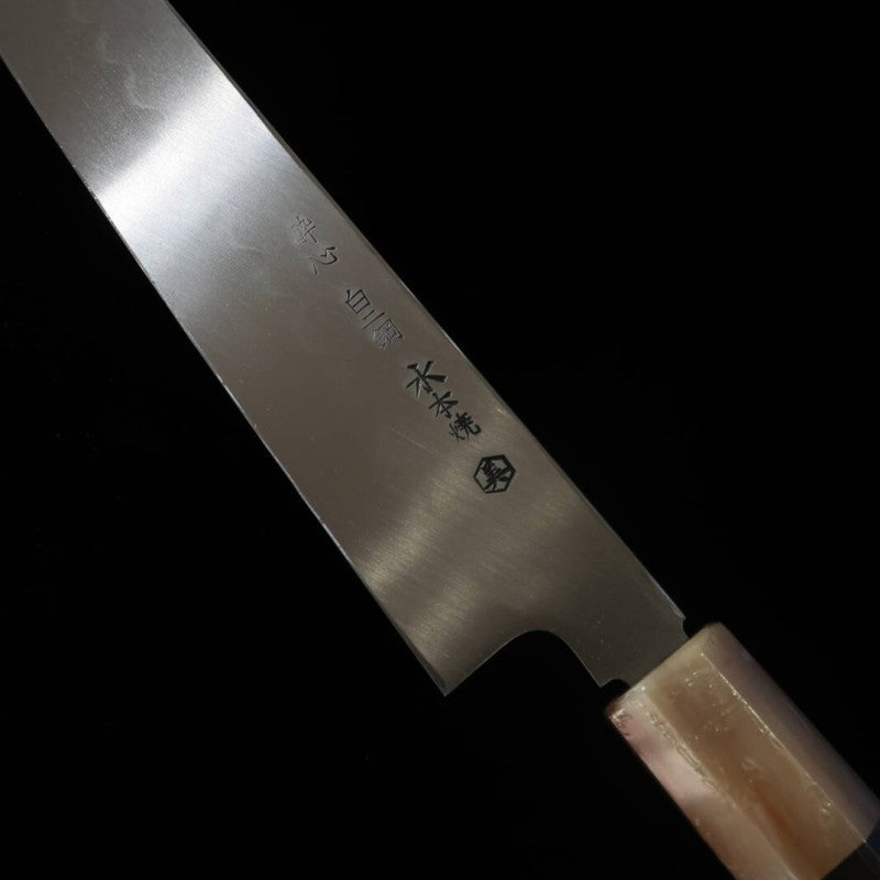 SUISIN Suisin Mizumoto-yaki Ikeda Miwa Hakushi Shirogami No.2 Manche en ébène avec fourreau en magnolia, lame yanagiba type ken (300mm)