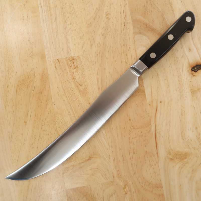 赤身肉のステーキを鉄板の上で直接切り分けるのに便利な反り上がった切っ先を持つカービングナイフです。