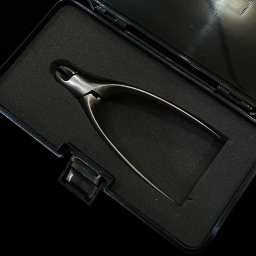 Cortador de unhas tipo alicate, ideal para cortar unhas grossas e duras dos pés, com um belo formato aerodinâmico exclusivo do método de fabricação MIM. Tamanho S, fácil de segurar até para mãos femininas.