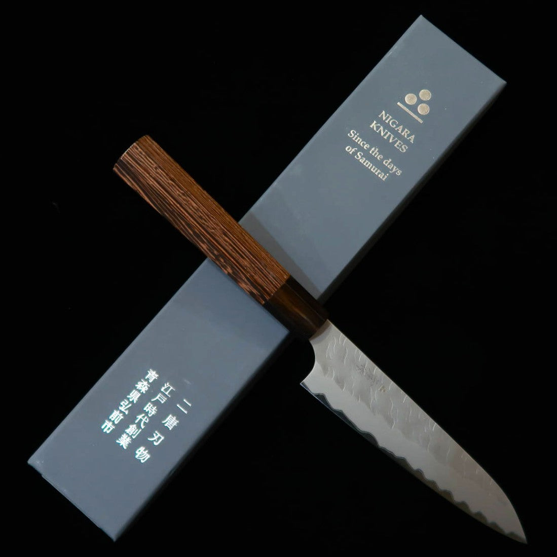 二唐刃物鍛造所 NIGARA ペティ 青紙スーパー 鎚目 ウェンジ八角柄(150mm)